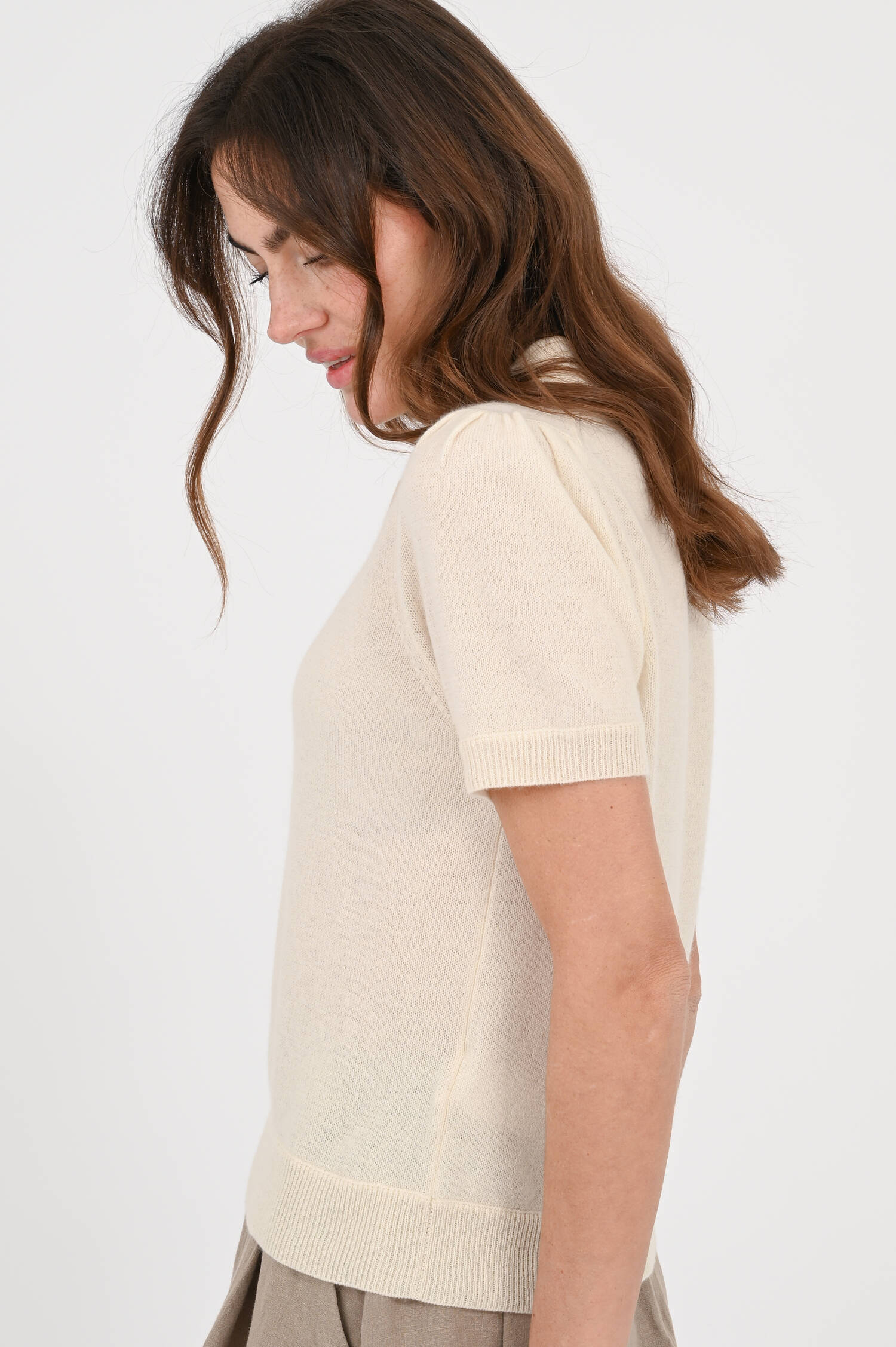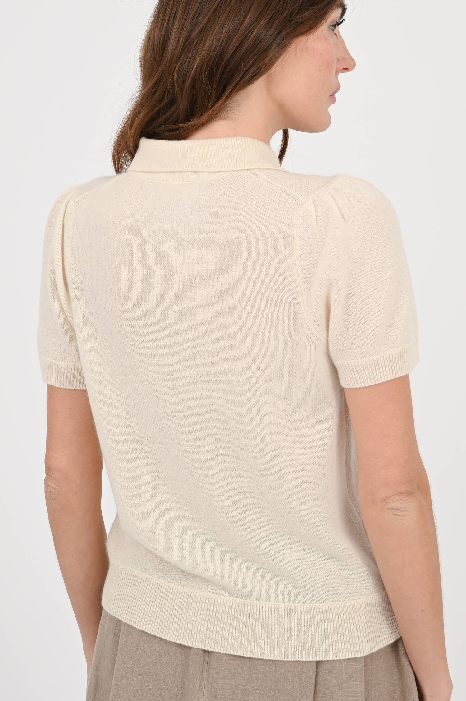 Cashmere Poloshirt mit Puffärmel in Creme